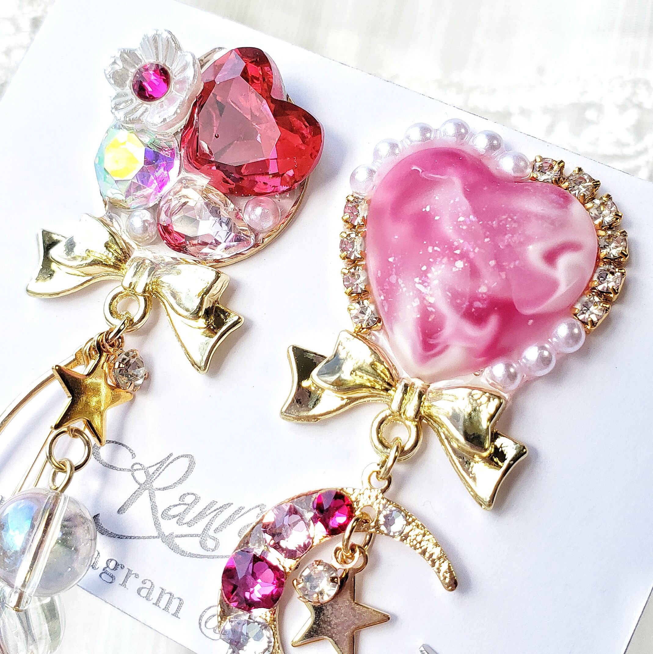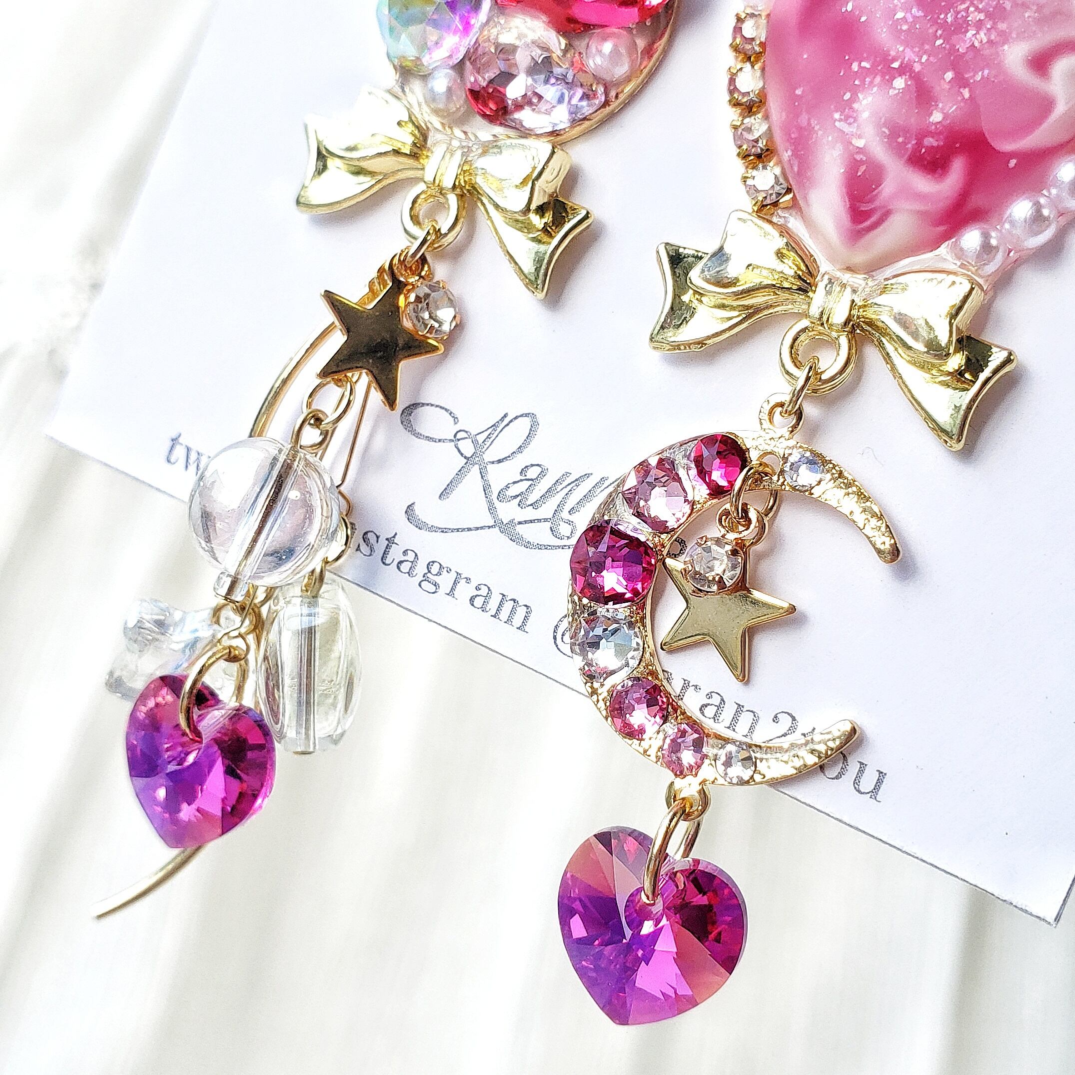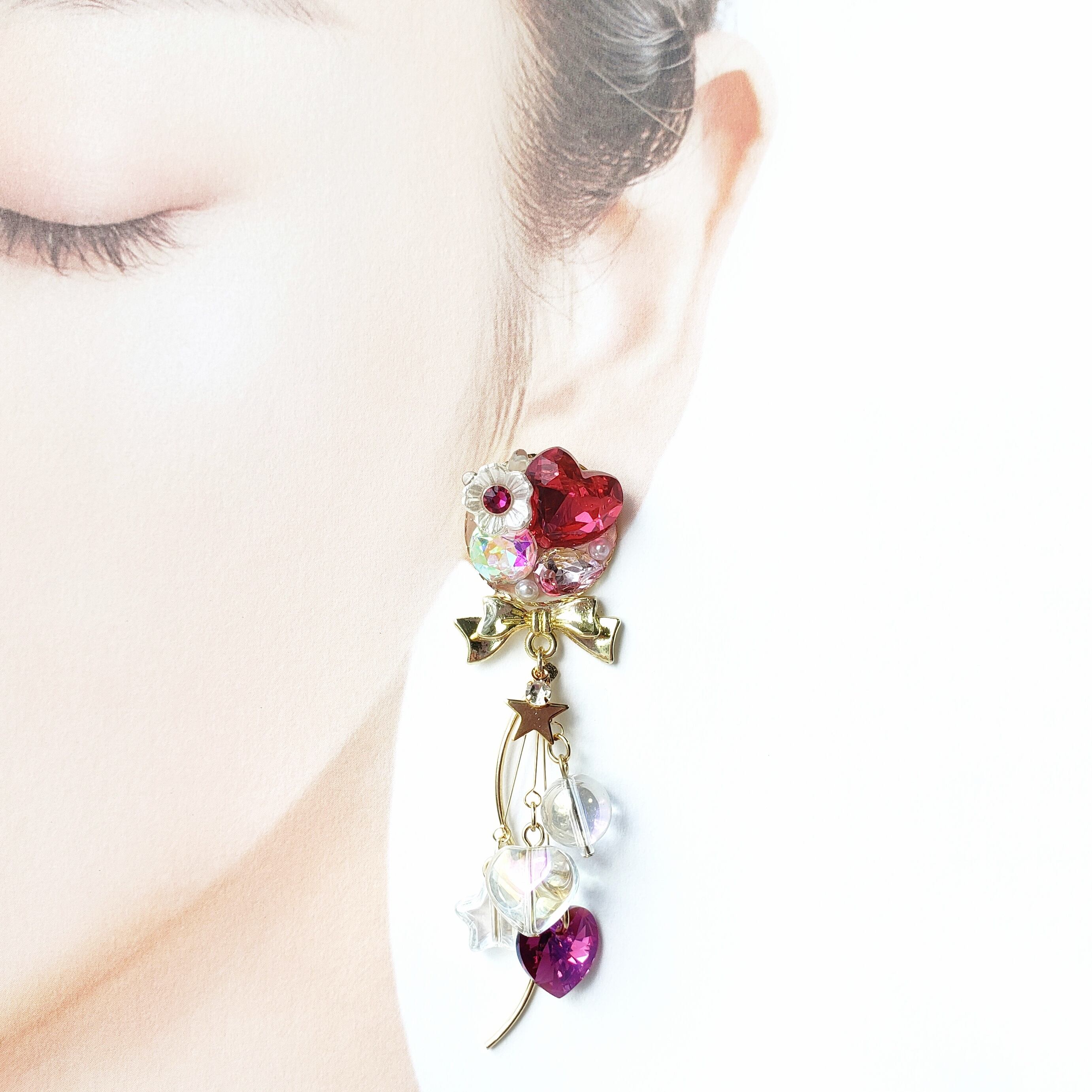 ルビーをイメージして、ローズ・フィッシャーというカラーのガラスストーンやスワロフスキーを使用して制作致しました。