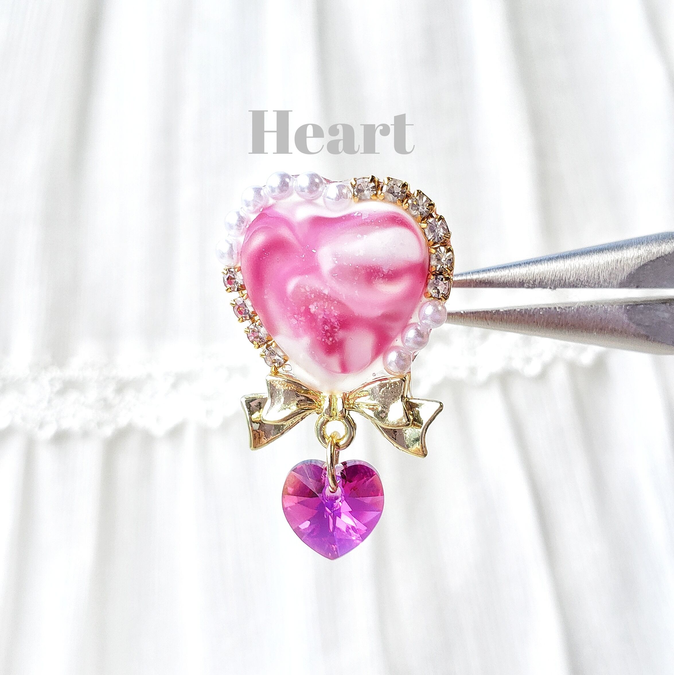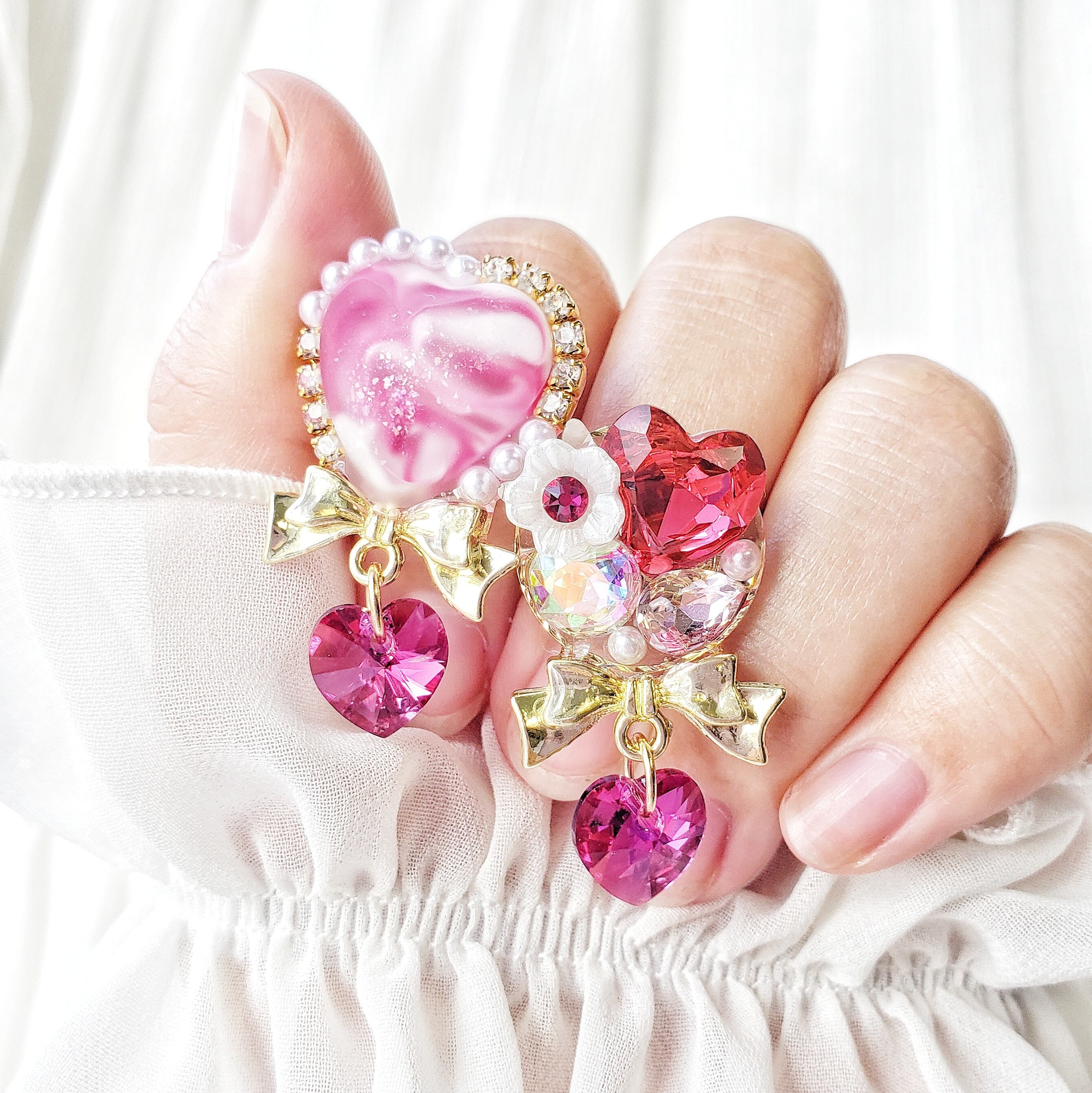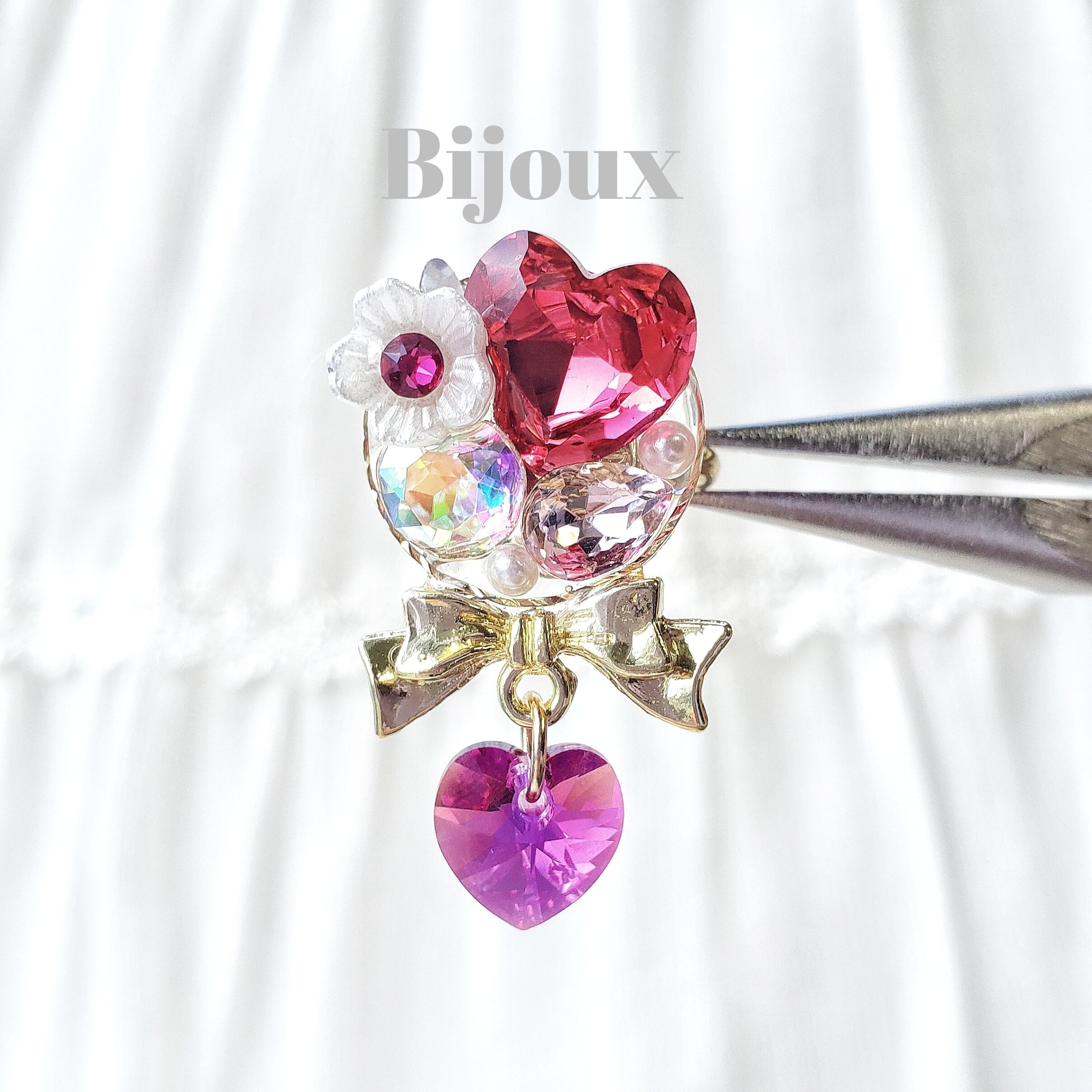 ルビーをイメージして、ローズ・フィッシャーというカラーのガラスストーンやスワロフスキーを使用して制作致しました。